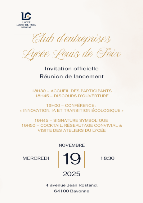 Le mercredi 19 novembre 2025 à 18h30, le lycée Louis de Foix accueillais la réunion de lancement du Club d’Entreprises à Bayonne.